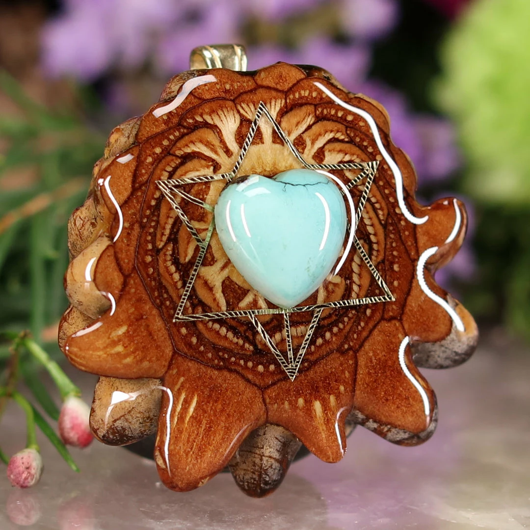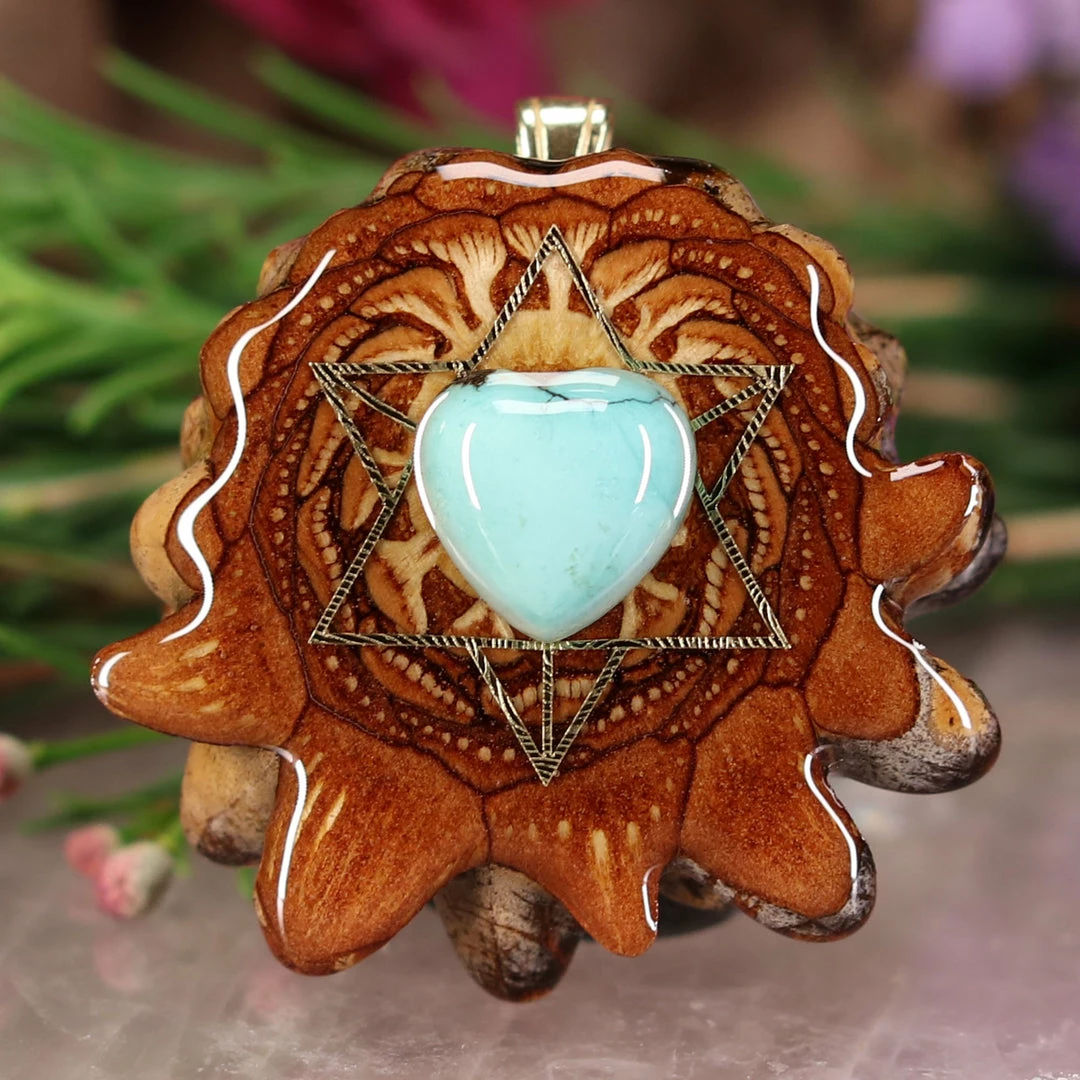 Every pinecone pendant is an elegant gift from Mother Nature — unveiling the ornate Sacred Geometry hidden at the center of one of the world’s densest Pinecones. Because only one cross-section is taken from the “heart” of each Cone, every pendant is absolutely unique, and truly one-of-a-kind.