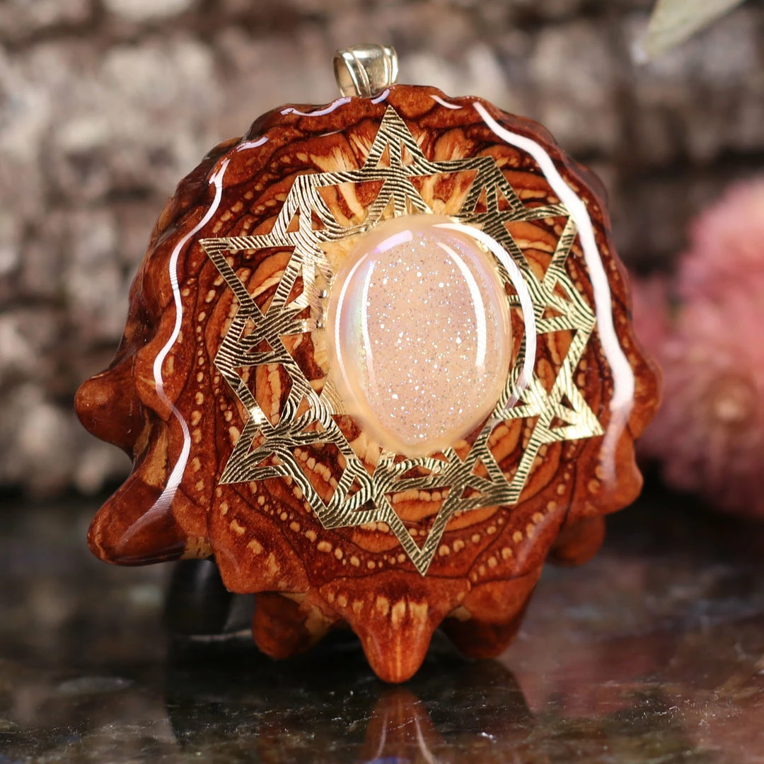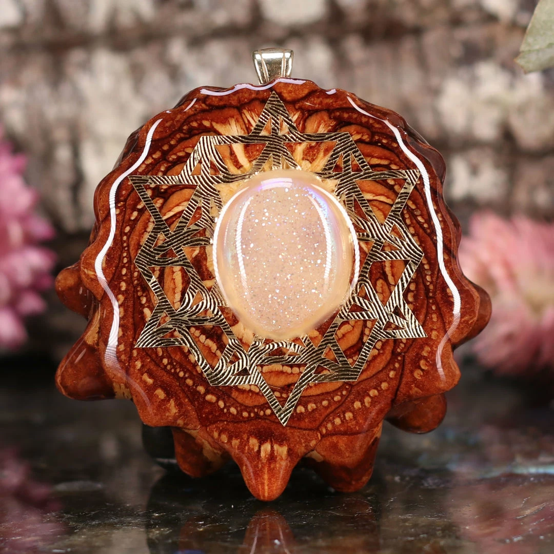 Every pinecone pendant is an elegant gift from Mother Nature — unveiling the ornate Sacred Geometry hidden at the center of one of the world’s densest Pinecones. Because only one cross-section is taken from the “heart” of each Cone, every pendant is absolutely unique, and truly one-of-a-kind.
