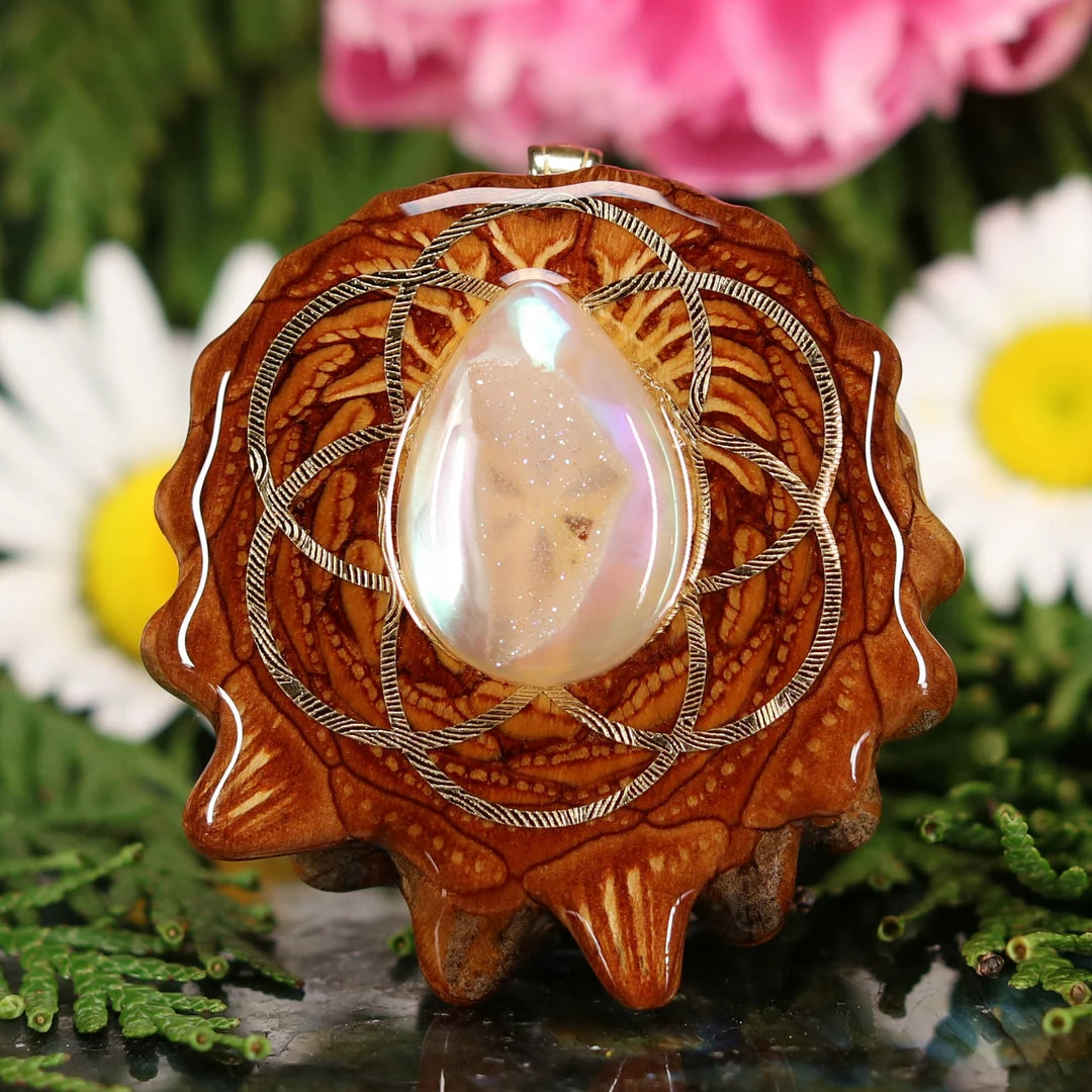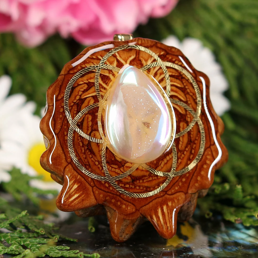 Every pinecone pendant is an elegant gift from Mother Nature — unveiling the ornate Sacred Geometry hidden at the center of one of the world’s densest Pinecones. Because only one cross-section is taken from the “heart” of each Cone, every pendant is absolutely unique, and truly one-of-a-kind.