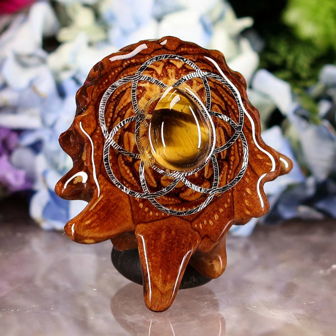 This Pinecone has been blessed with the Seed of Life, cast in Sterling Silver. This sacred symbol serves as the foundation or “Seed” for the Flower of Life, and represents the Seven days of Creation. It depicts the origins of all matter, in geometric perfection, with six circles (the six days of work) resting inside a seventh circle (the day of rest, the sabbath).
