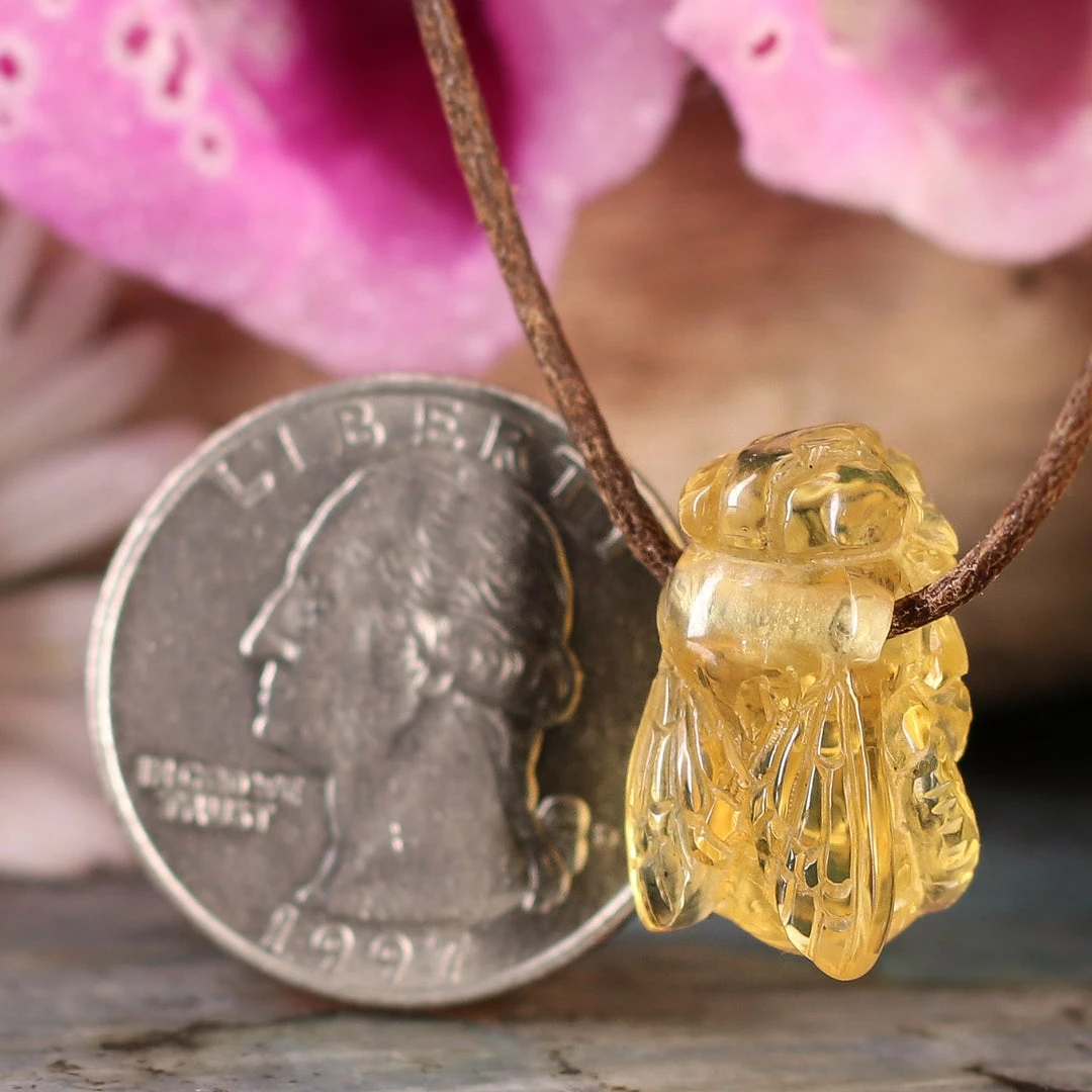 Hand-carved from translucent Amber, each honey-bee is entirely unique — providing a one-of-a-kind connection to the potent, healing energy of the Bee.