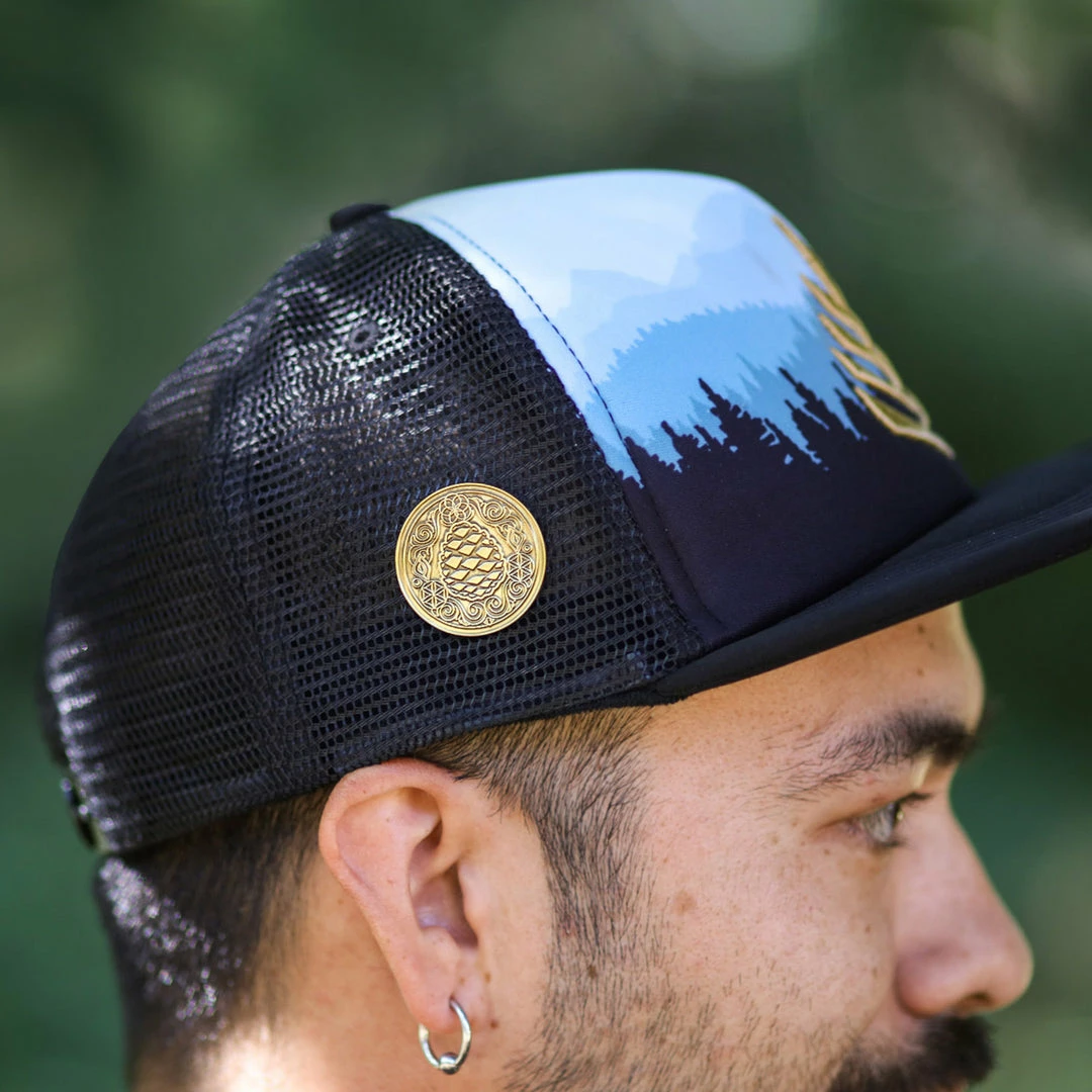 These fun and attractive trucker hats are custom embroidered on durable fabric with breathable mesh sides. A Golden Pinecone is elegantly stitched into the center of each hat. We feature 3 EPIC styles, a Purple Mountain-Scape, a Blue Forest-Scape & Classic Black with our Mandala Logo. A beautiful collab with Sacred State Design, these hats are adjustable Snap-Back, and available in 1 size: