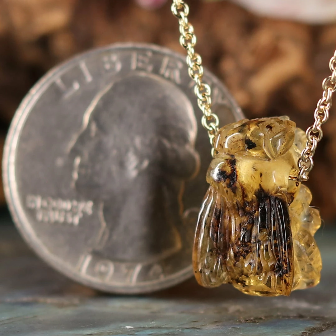 Hand-carved from translucent Amber, and lovingly strung on a 14k Gold 18” Fancy Segmented Chain. Each honey-bee is entirely unique — providing a one-of-a-kind connection to the potent, healing energy of the Bee.